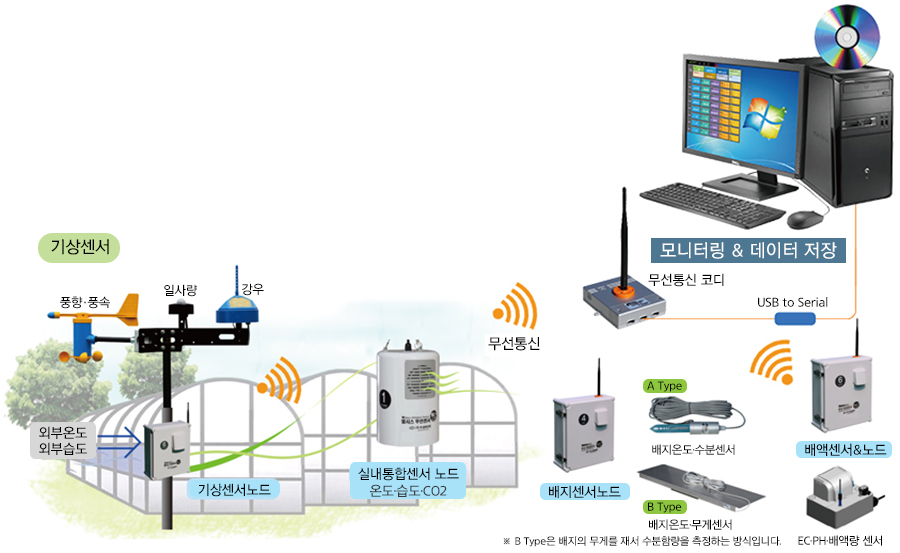 각종 환경센서의 데이터를 모두 무선통신방식으로 처리하므로 간결하게 시스템을 구축할 수 있습니다.