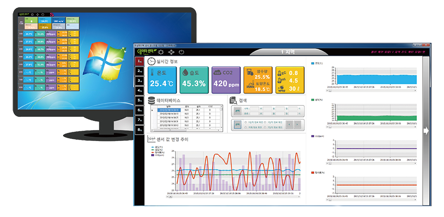 시설원예 내·외부의 환경정보를 컴퓨터로 모니터링하는 시스템입니다. 각종 환경센서가 취득한 정보는 컴퓨터에 자동저장되며 집계표 또는 그래프로 표시됩니다. 또한, 사용자 경보값을 설정하여 위험에 대응할 수 있으며 컴퓨터에 저장된 데이터를 활용하여 재배환경을 더 효과적으로 관리할 수 있습니다.